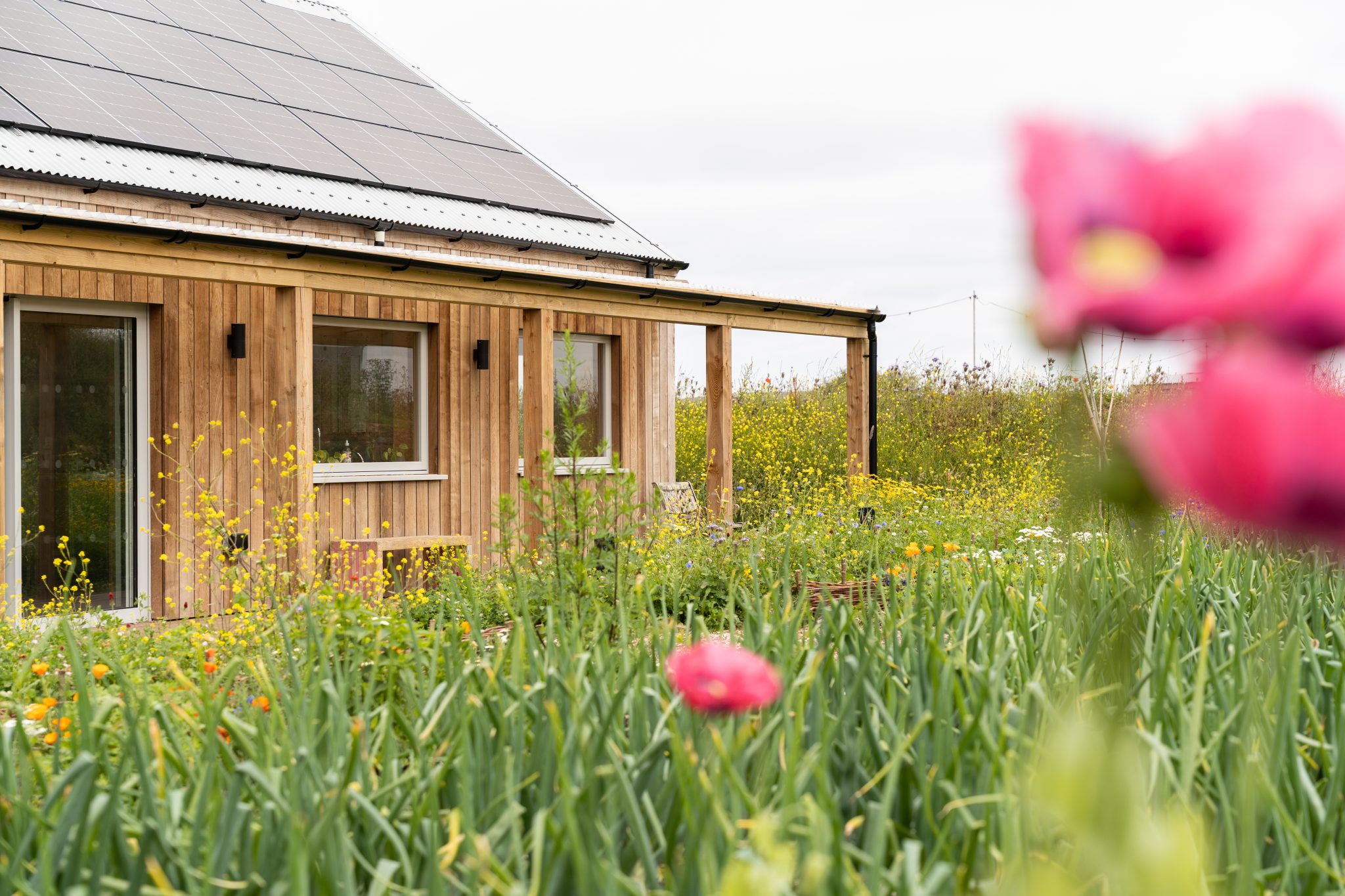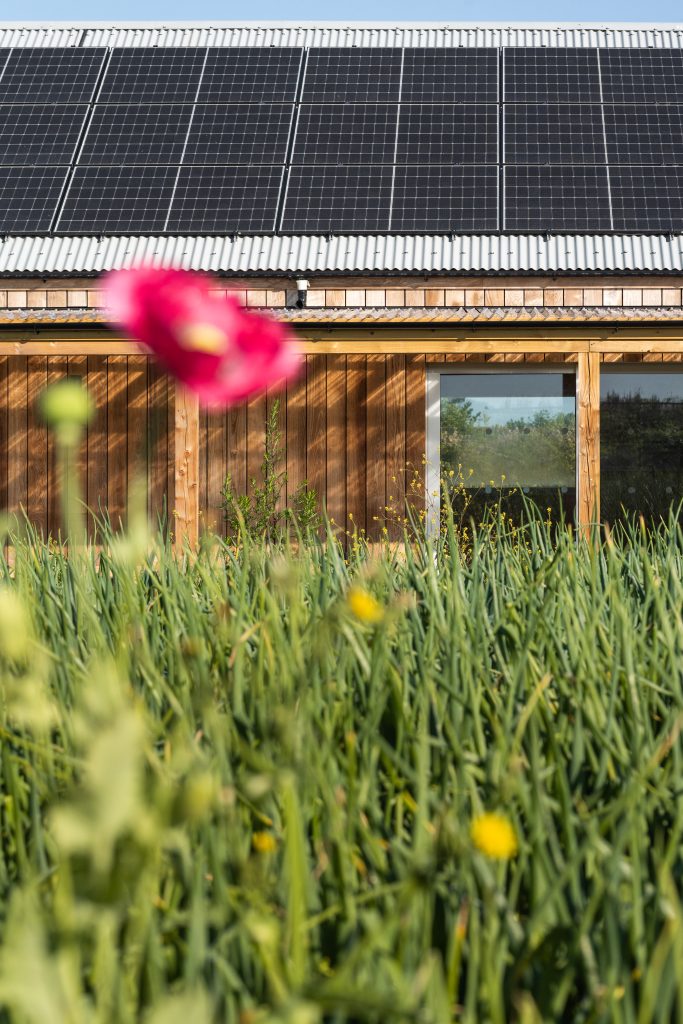 Above, a profiled metal roof with an array of south-facing PV panels provides renewable energy, while high levels of insulation and airtight construction deliver comfort and low running costs throughout the seasons. The combination of thermally modified cladding with these energy-efficient features creates a building envelope that performs exceptionally well while maintaining the natural, organic aesthetic appropriate to its agricultural setting.
